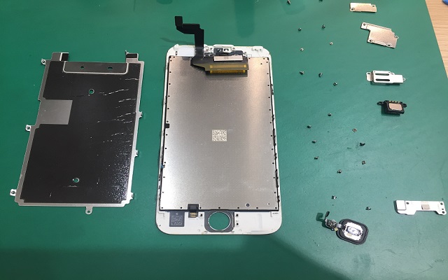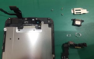 4.フロントパネルにはイヤースピーカー、インカメラ、インカメラガイド、ホームボタン、液晶プレート等細かいパーツが付いていますのでそれぞれを取り外していきます。