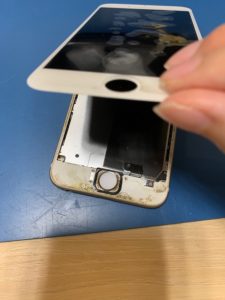 このフレーム部分は、決して弱い圧着ではないのですが、衝撃や圧力が加わると剥がれてしまいます。一部分が分離してしまい、浮いている状態で修理依頼を頂くことは多いですが、今回のようにフレーム全てがフロントパネルから剥がれているのは、非常にまれです。