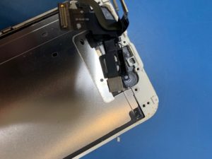 iPhone6の内部です。パネルがすっかり分離していた為、バッテリー上のホコリが特に目立ちますね。