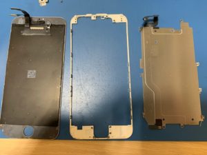 真ん中にある白いフレームは、本来であれば、左にあるフロントパネルに圧着されていたパーツです。インカメラ部分の丸みや、ホームボタン周りのところなどを見ると、パズルのようにぴったり収まる形になるのがわかるでしょうか?