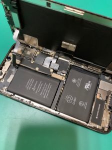 お持ち込み頂いた時の、iPhoneXです。まるで墨で塗ったような、黒いにじみが出てしまっています。ちなみにこの黒い部分、タッチ反応は消えていないので、操作はできる状態です。逆に、右はじに見える光の強い縦線部分、こちらのタッチ反応は消えてしまっていました。