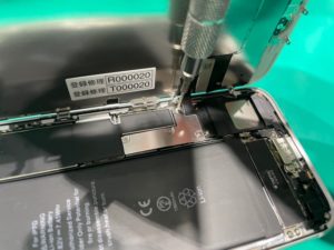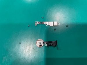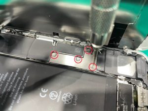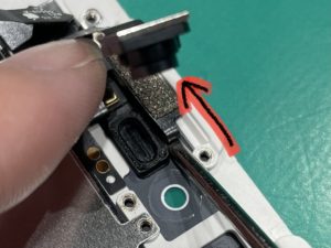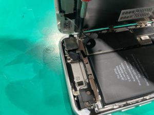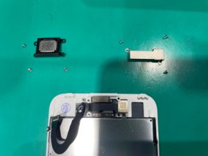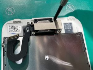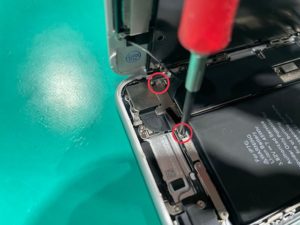 画面上部にある赤丸6つのネジとプレートを取り、イヤスピーカーを取ります。