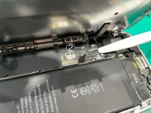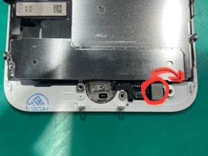 11.右側(赤丸)に本体側のケーブルとくっついているホームボタンのコネクタがあるので、それを矢印の方向に外します。