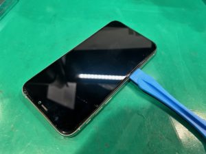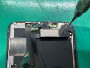 1.まず電源を切り、下ネジを2本外し、フレームと画面の間にヘラを入れます。