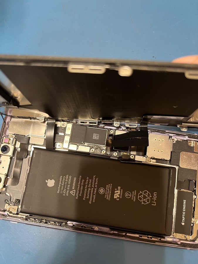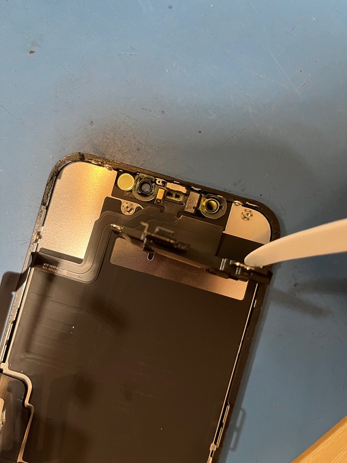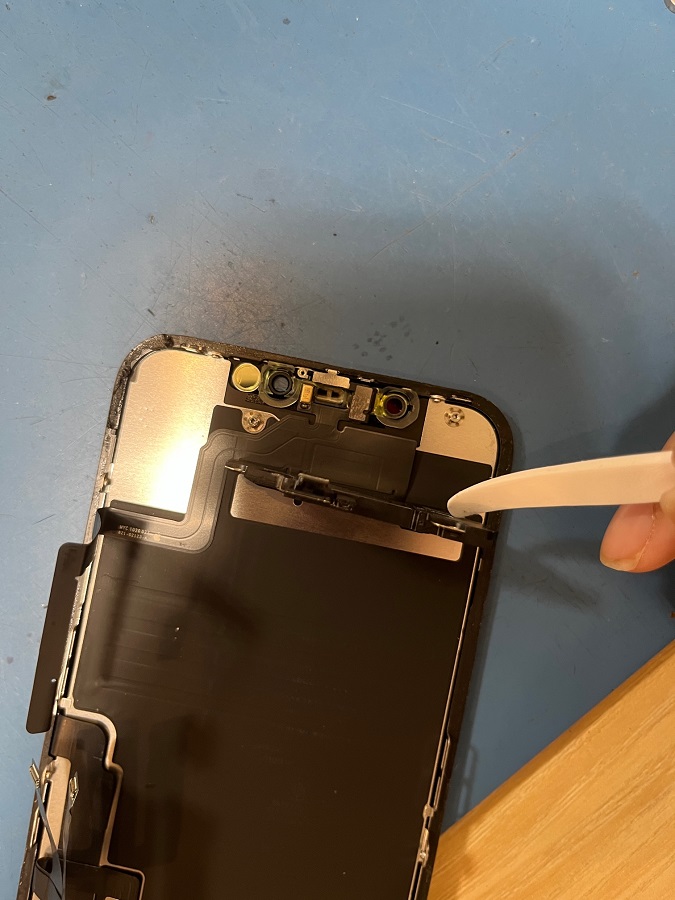 iPhone11のバッテリーコネクタは、フロントパネルケーブルの真下にあるので、先にフロントパネルケーブルを外す必要があります。