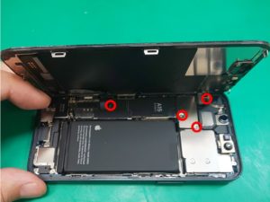 まずはライトニング脇のネジを2本外し、粘着テープを弱める為、本体を温めます。
