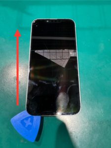 3.画面が割れているため金属の薄いヘラで上に持ち上げ隙間が開いたら、青いヘラを差し込み少しずつ粘着を剥がしていきます。