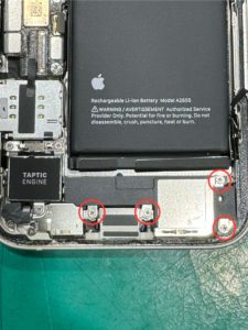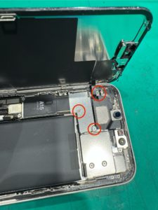 11.バッテリーを取り外す為に、下部にあるスピーカーを取り外す必要があるので4か所のネジを取り除きます。