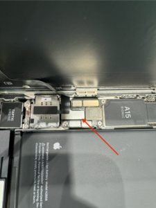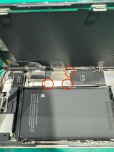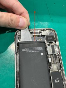 12.取り外したら、赤丸部分のシールを引っ張ってバッテリーを取り外していきます。