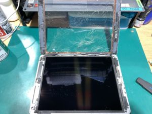 パネルが浮いてきたらフロントガラスを動かないところに立てかけ、端末からフロントガラスを外す作業になります。