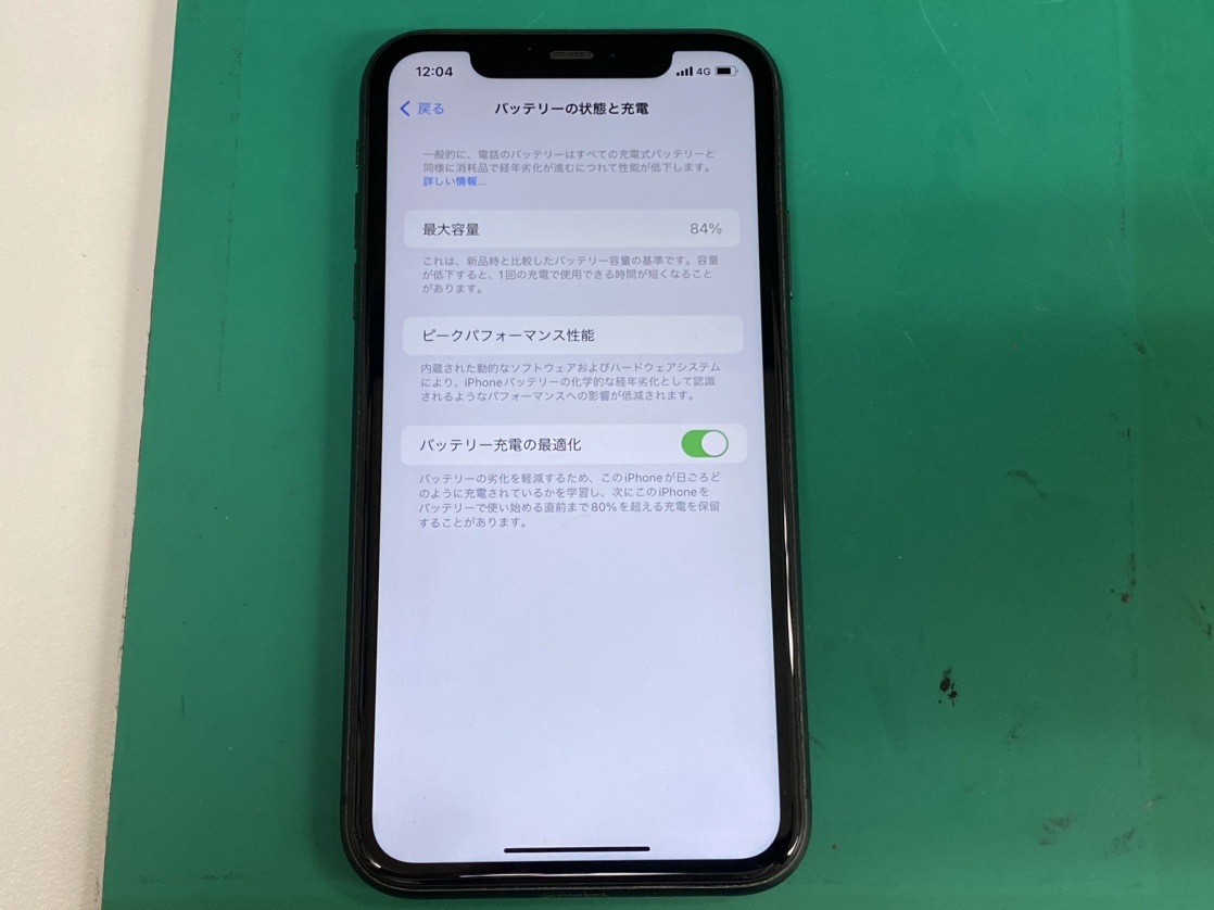 4年半ほどお使いになられていたようで、バッテリーの最大容量も84%まで落ちていました。