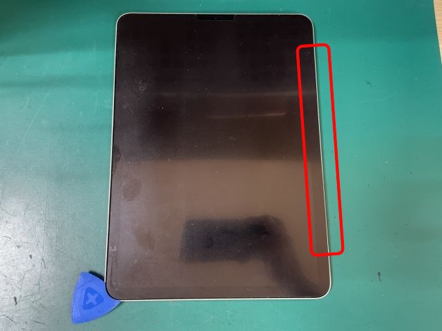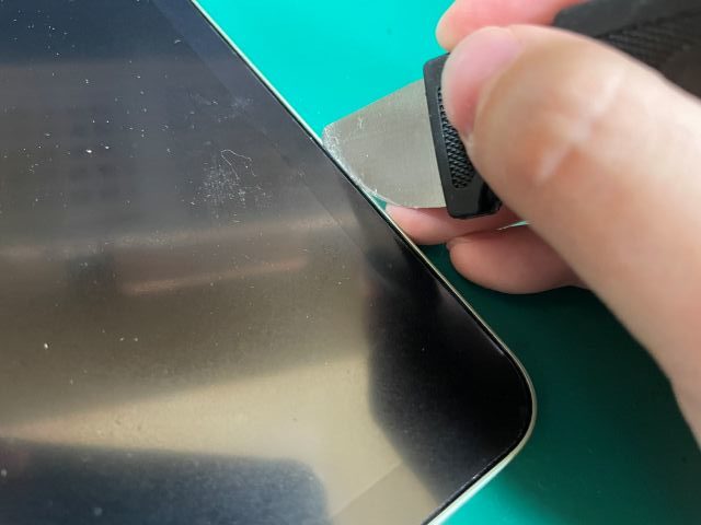 2.画面とフレームの隙間に薄いヘラを差し込み、画面の粘着を剥がしていきます。