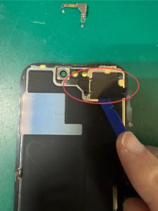 9.画面の裏側にある赤丸部分のフロントセンサーケーブルを外します。