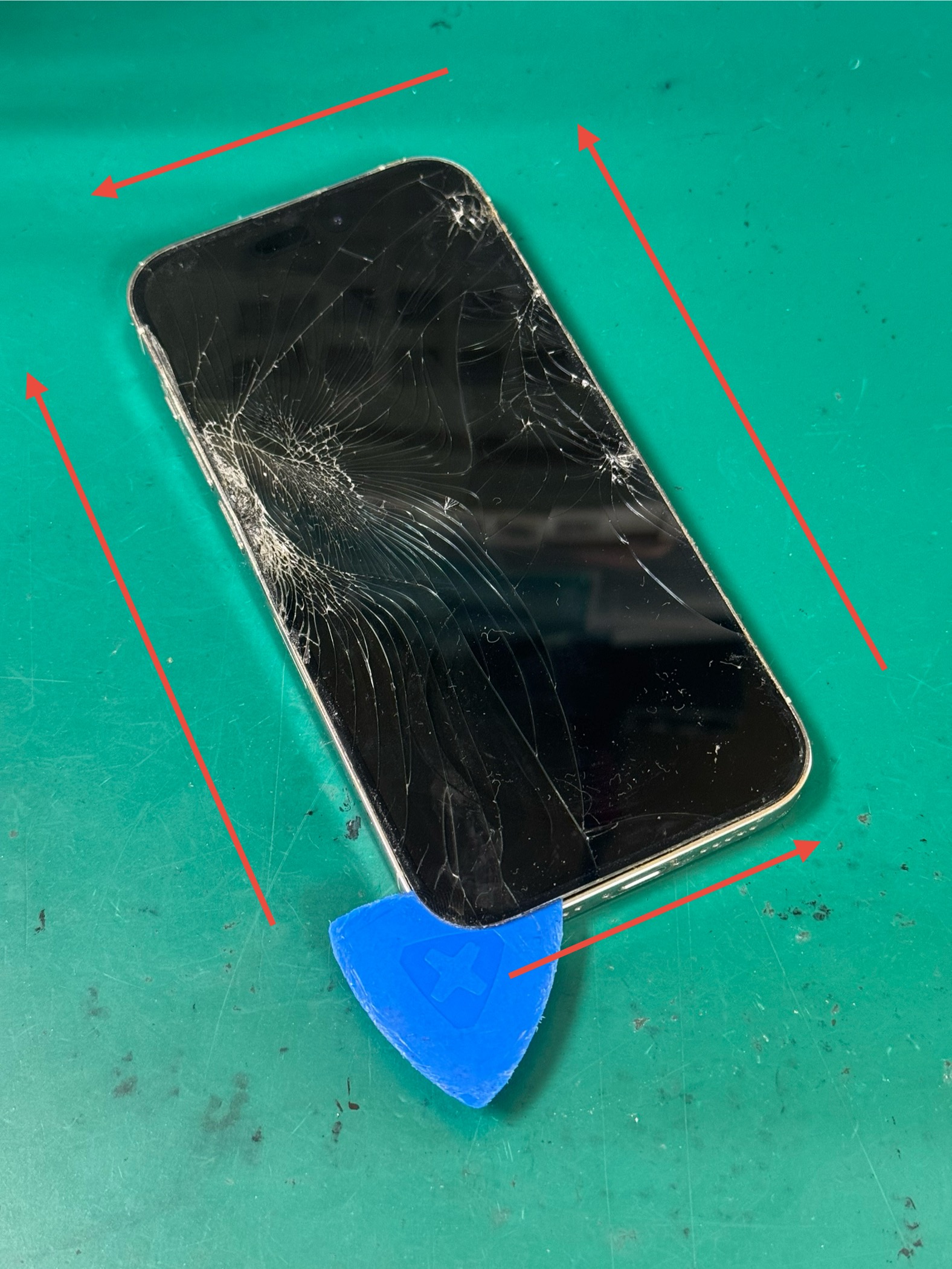 隙間ができたらプラスチックのヘラを差し込み、端末を取り出します。