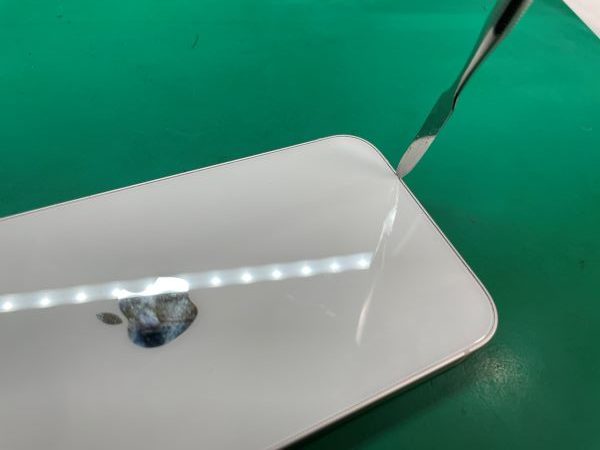 粘着を弱める液体を端末下部になじませ、専用器具を用いて隙間を作ります。