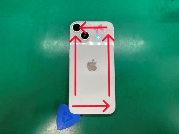 ヘラを下の写真の赤線にしたがって動かし、画面を慎重に開けていきます。