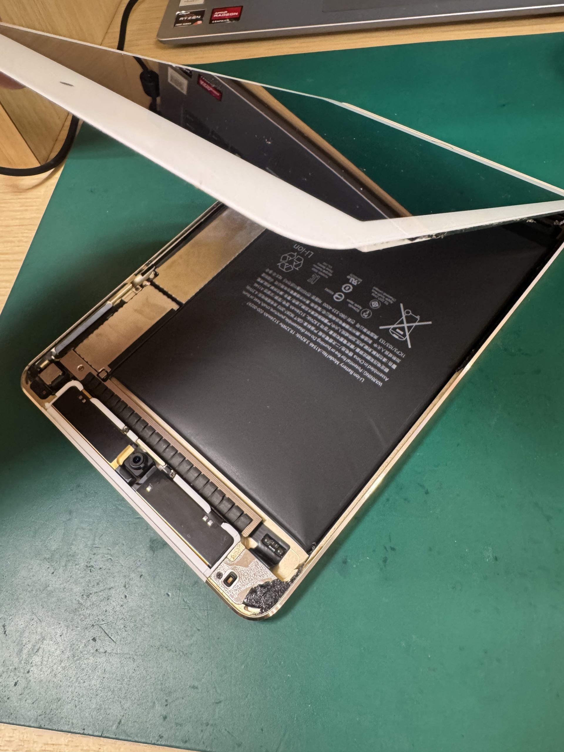 修理前の症状:バッテリーが膨張し、画面がやや起き上がっております。