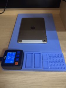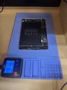 1.画面を開ける準備をします。加熱マットを使い端末を両面温め