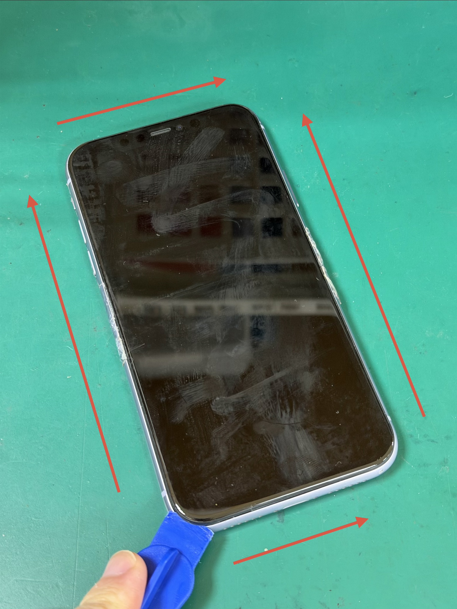3.プラスチックのヘラを矢印の方向にスライドして画面を開けていきます。