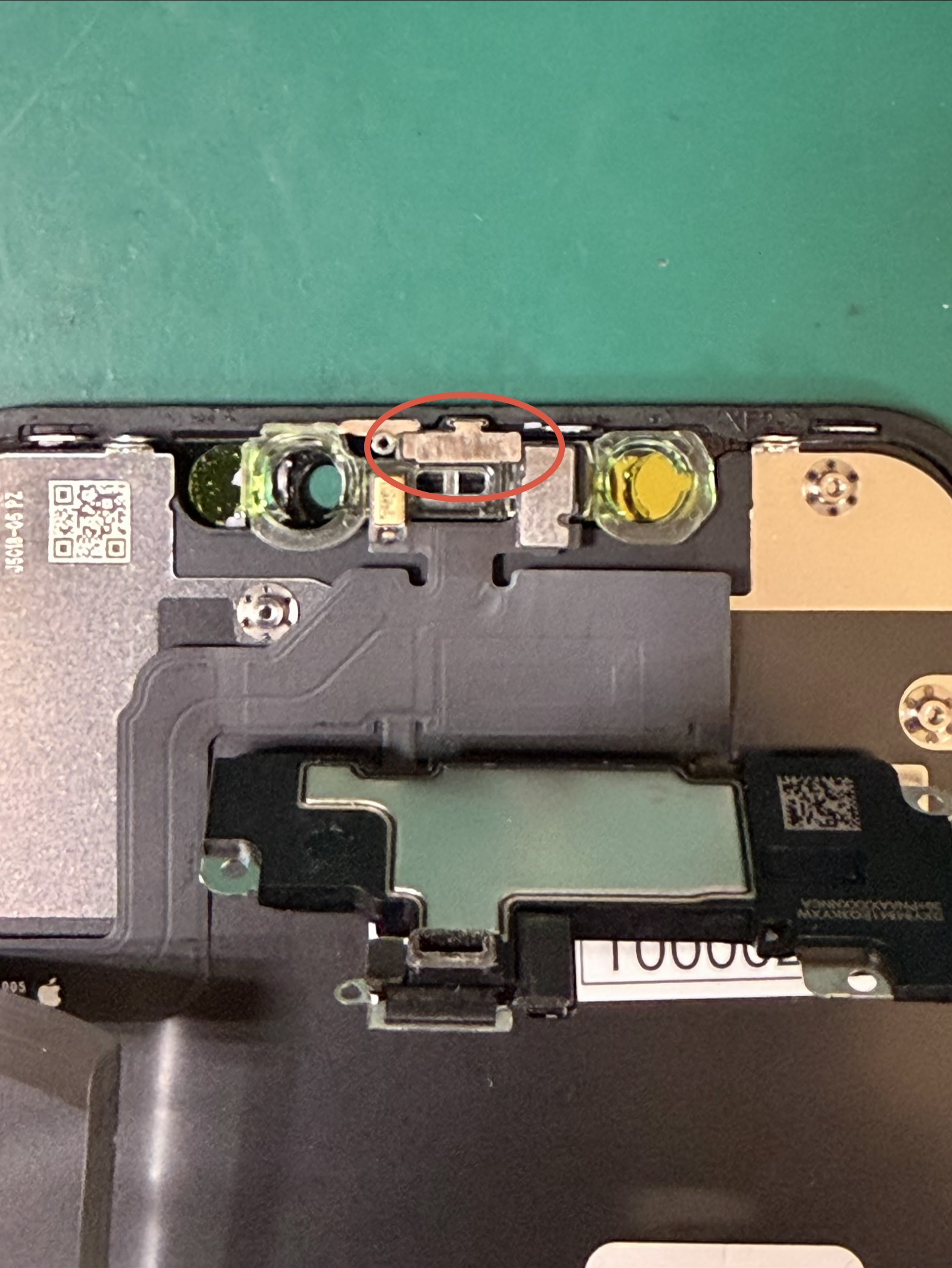 9.イヤースピーカーを手前に起こし、赤丸部分が金属パーツで固定されているので