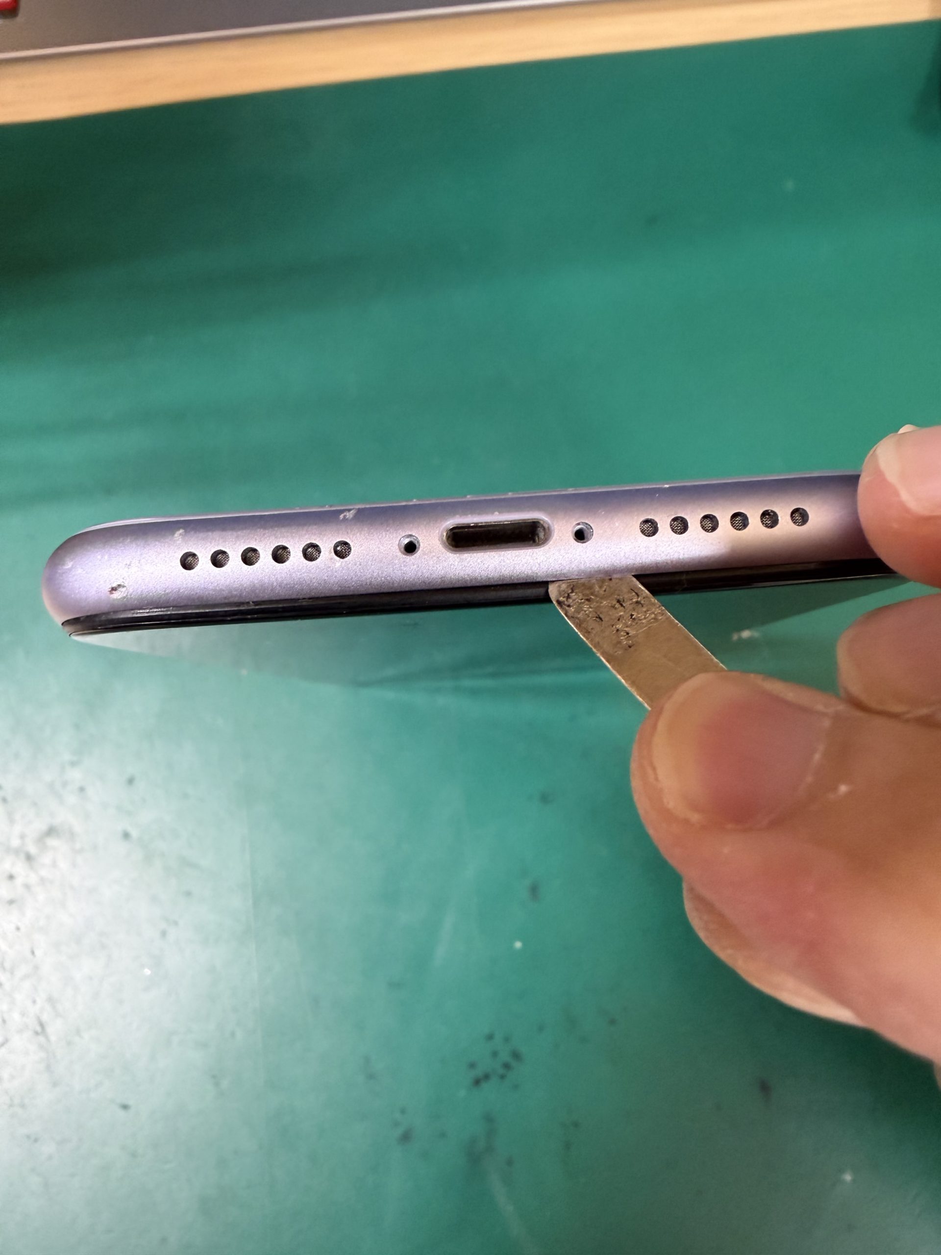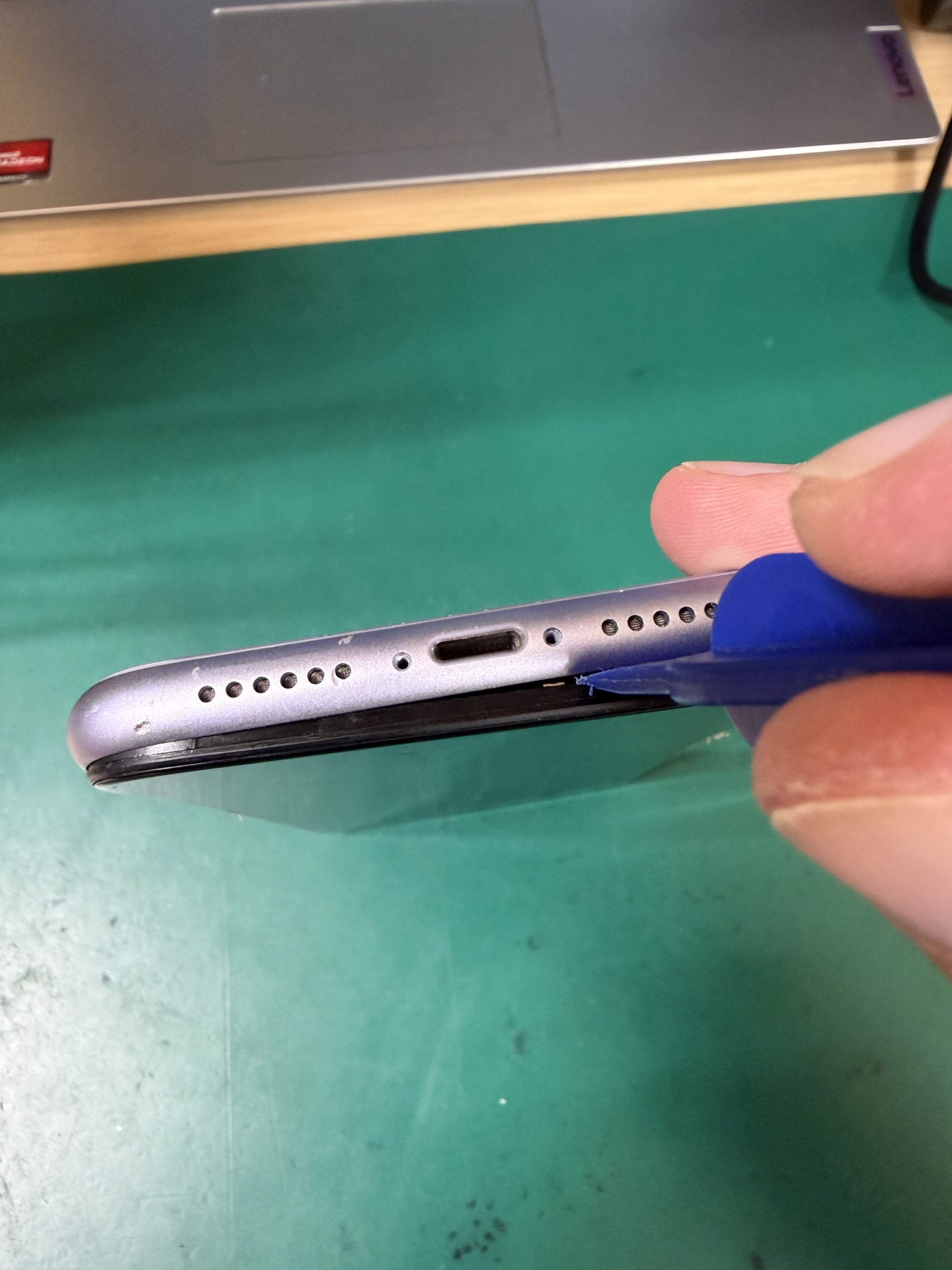 2.本体下部の画面と本体の間に金属ヘラを差し込んで隙間を作ります。