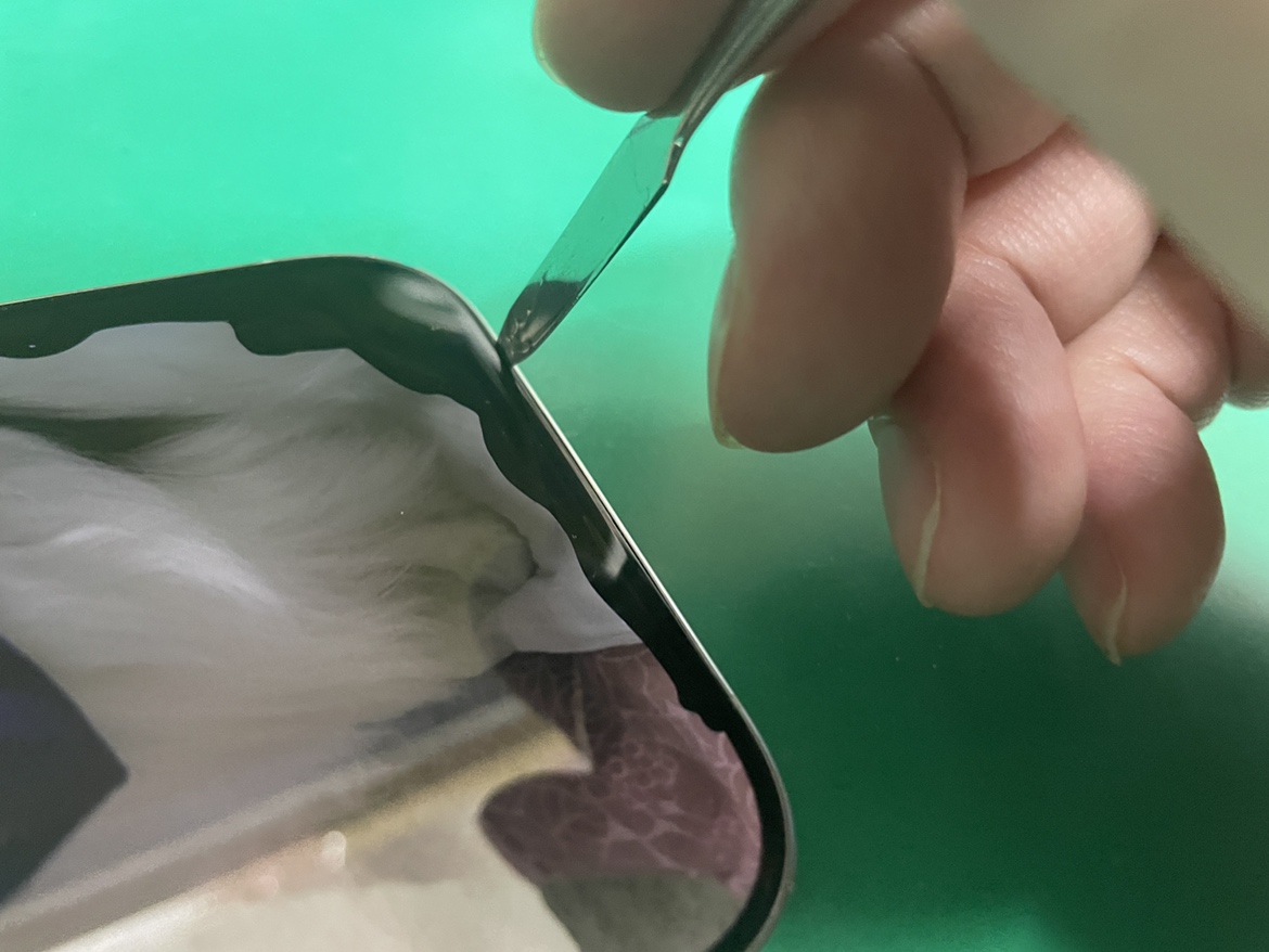 粘着を弱める液体と専用の機器を用い、画面下部に隙間をつくりヘラを挿し込みます。