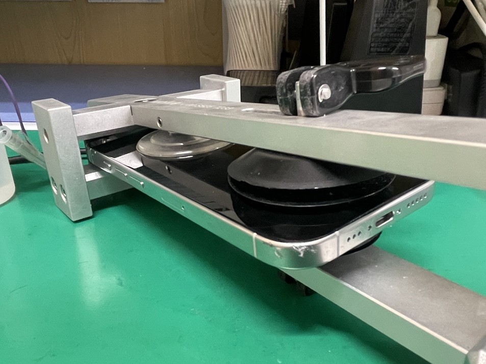iPhone12以降の端末は画面の粘着が非常に強力となっているため、加熱マットを使用し60~70℃で 温めます。
