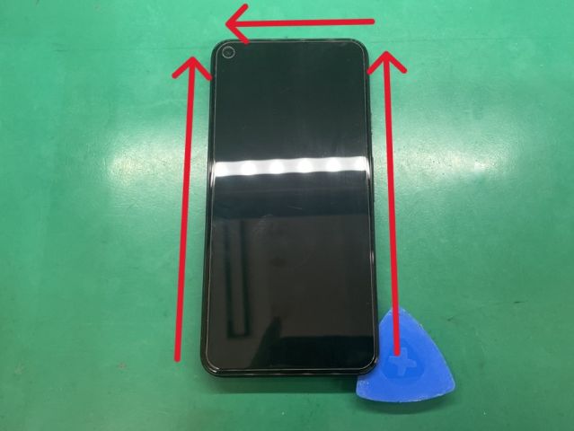 粘着を弱める液体を使用し、画面下部に金属ヘラで隙間をつくります。