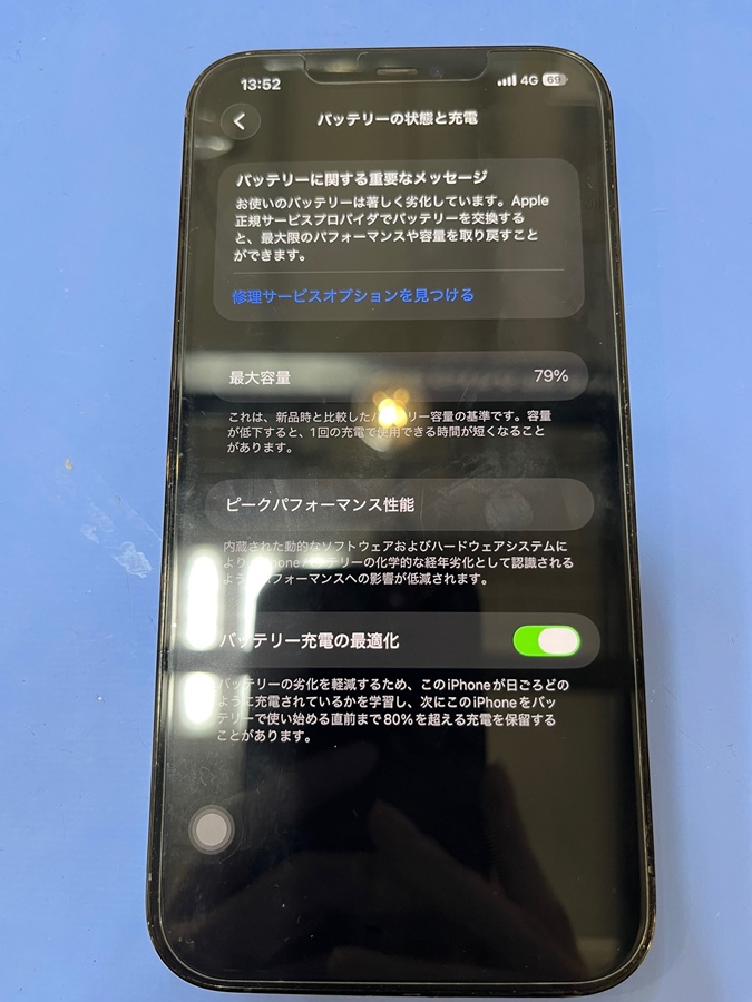 バッテリーの消費が早くなっているとのことで、状態を確認したところ、最大容量が79%にまで下がっていました。