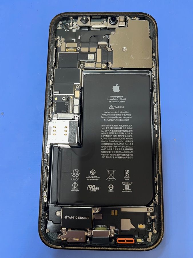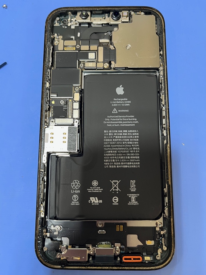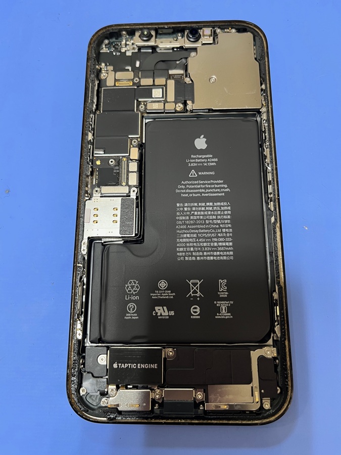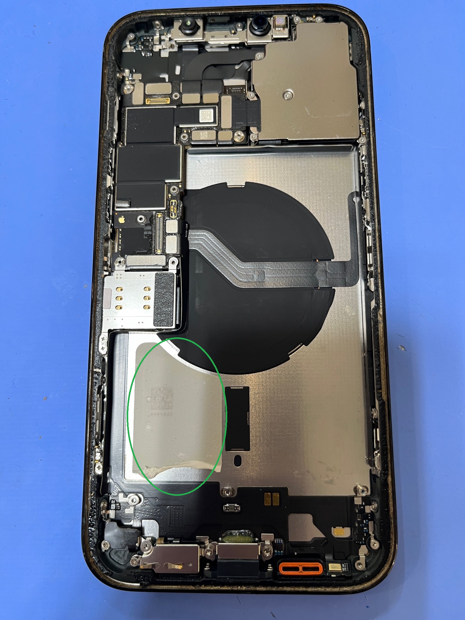 端末に残ったバッテリーシールをはがし取る際、基板や、ワイヤレス充電機能の部分を傷つけないよう、慎重に作業を進めました。