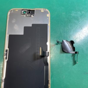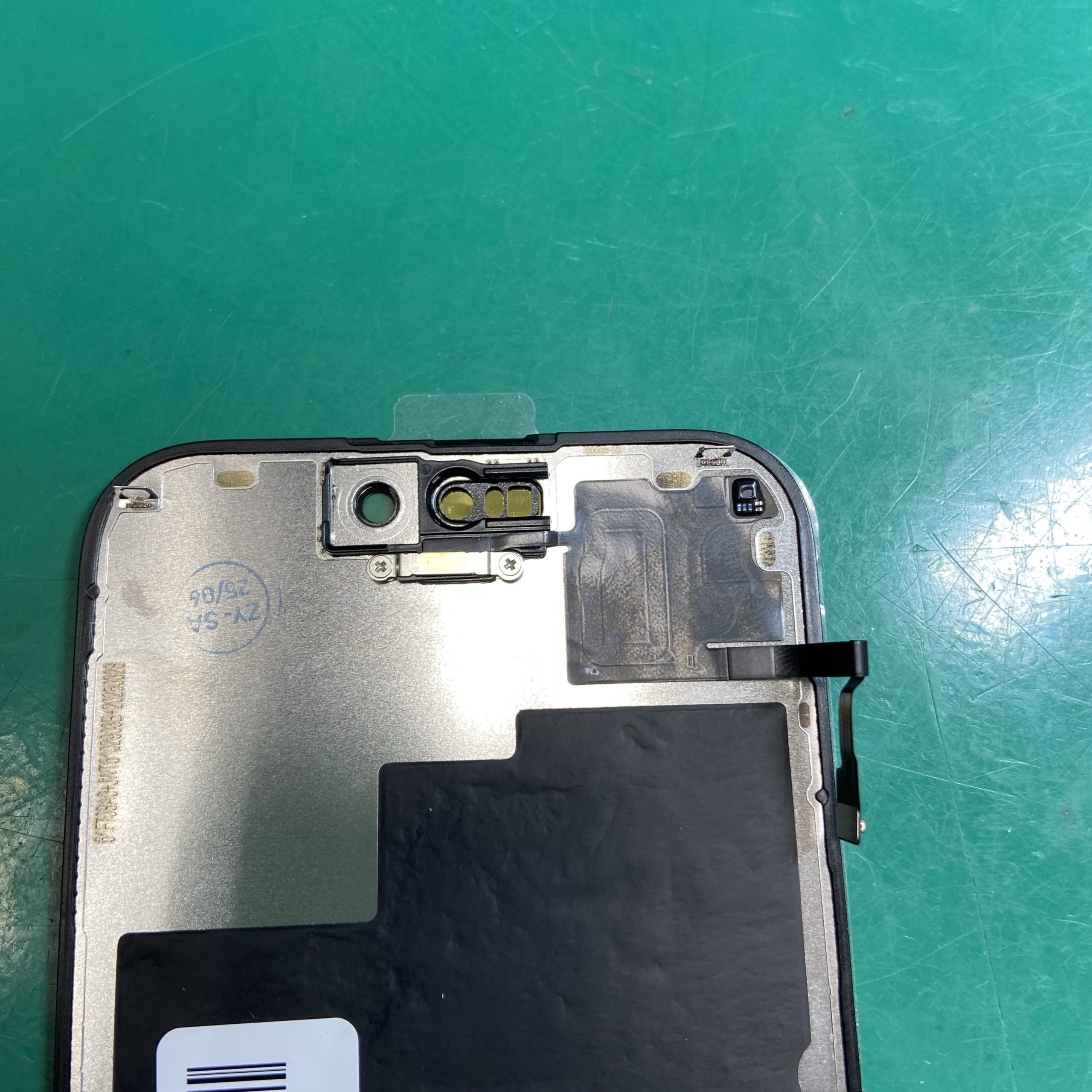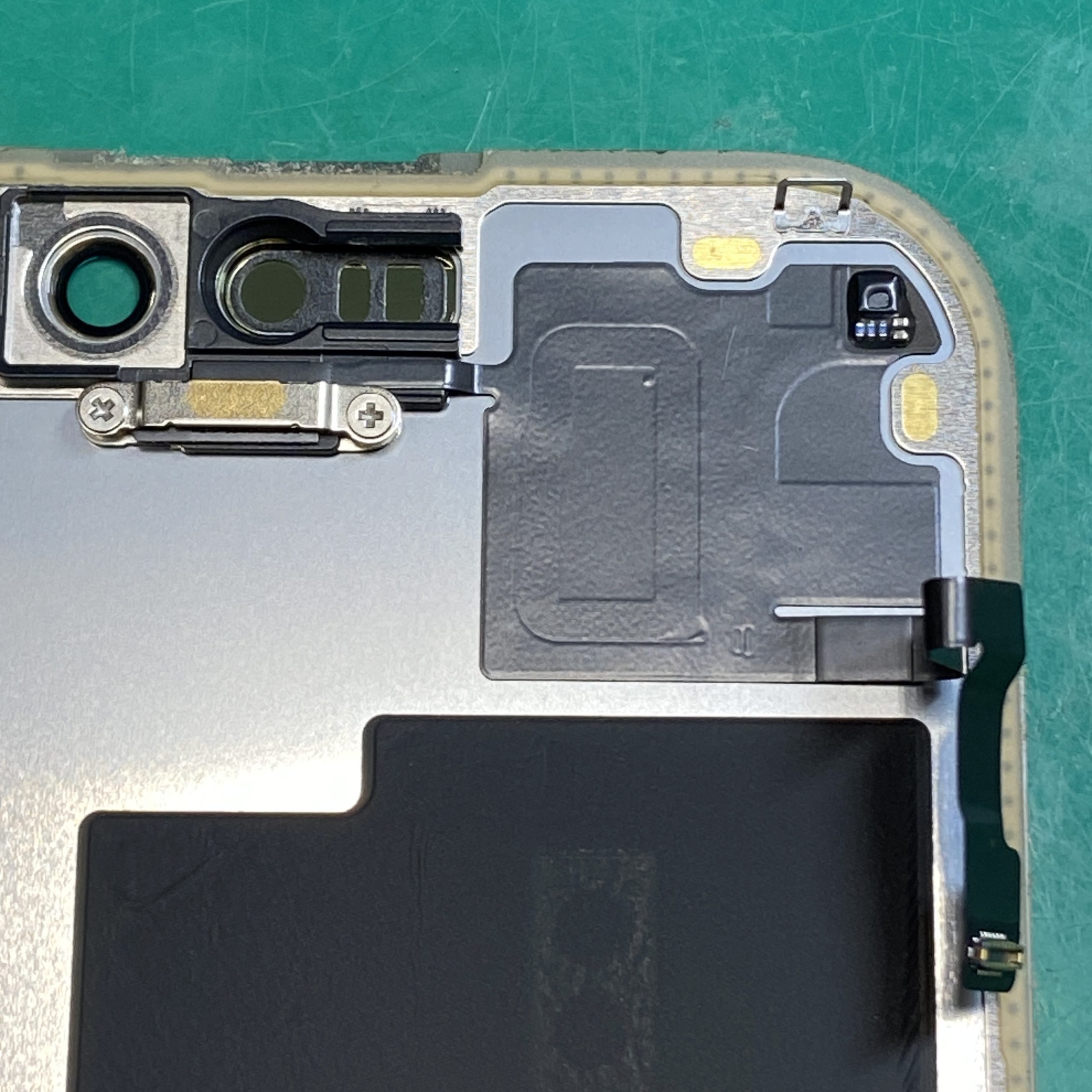 外したフロントセンサーを交換用ディスプレイに取り付け、両面テープでフレックスケーブルを貼り付けます。