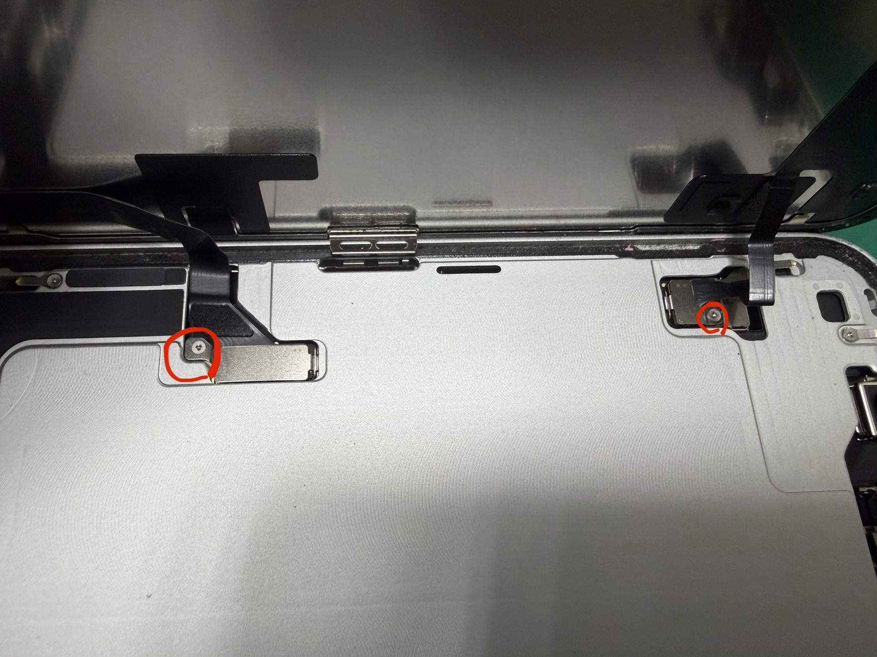 画面を開いたら赤丸のコネクターの金属カバーを取り外し、ケーブルを外します。