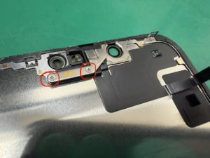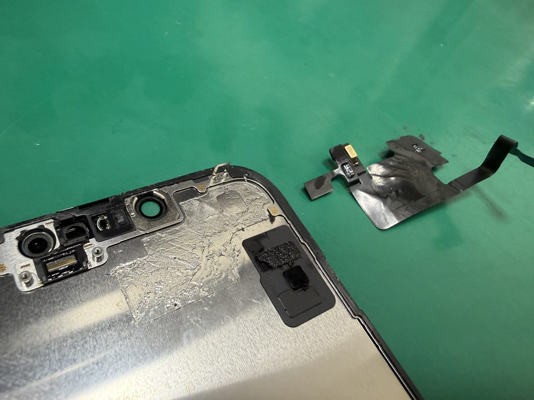 外したフロントセンサーを新しい画面に移植し、センサーケーブルカバーを戻します。