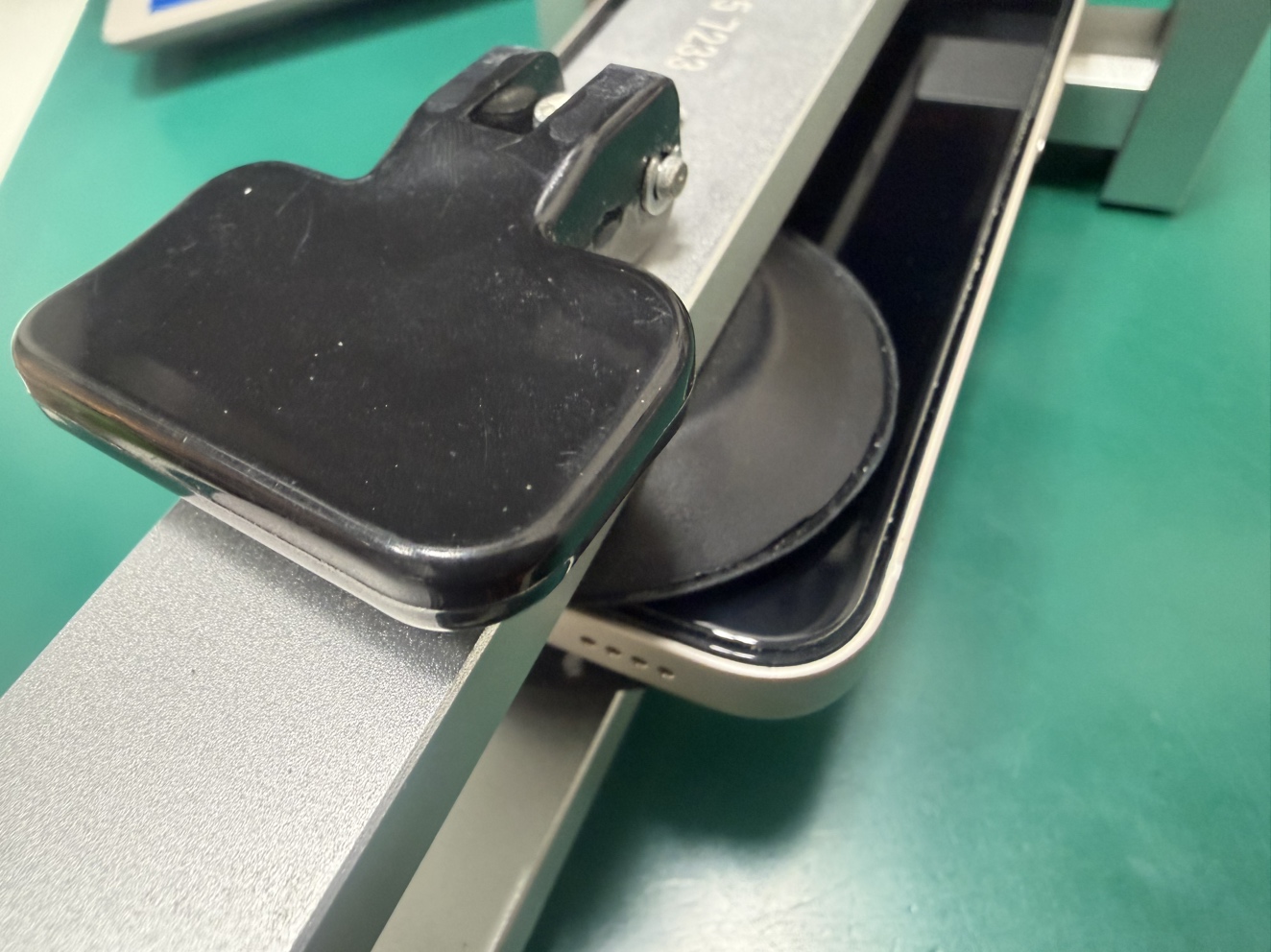 電源を落としたら端末の下ネジを外し、パネルヒータで画面を温めながら粘着を弱めます。