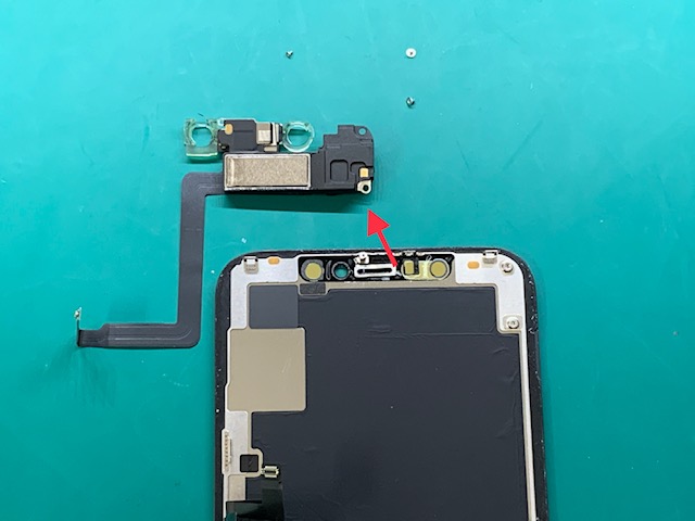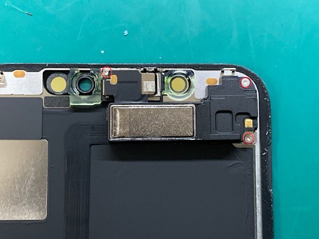 3箇所に取り付けられた、Y字ネジを取り外しセンサー裏側からイヤスピーカーごと剥がしていきます。