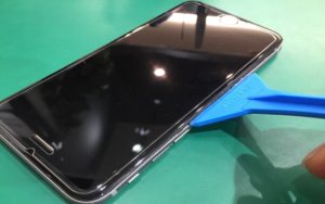 1.iPhoneの下に付いている2本のネジをはずして、専用のヘラを使いながらゆっくりとフロントパネルを起こしていきます。