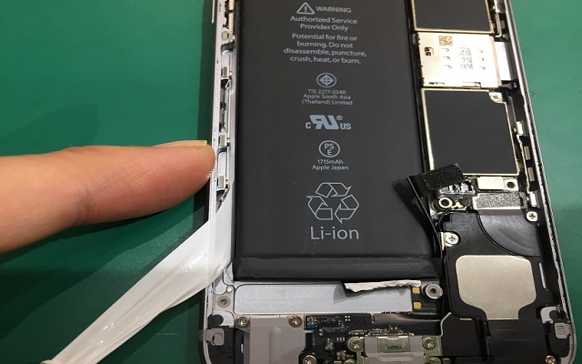 5.バッテリーは両面テープで固定されていますので、画像の様にテープの耳を剥がします。