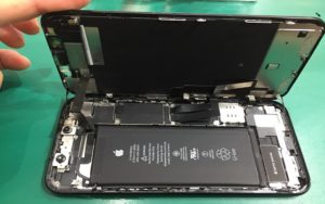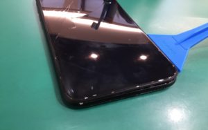 1.iPhone下部のネジ2本を外して、専用のヘラを使いながらフロントパネルを起こしていきます。