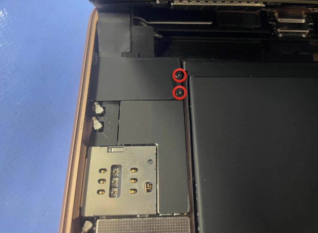 続いて、写真の赤丸部分に粘着が付いているので温めながら外していきます。