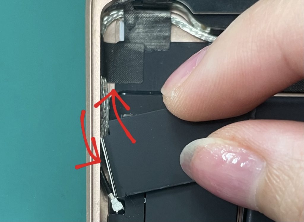 ラッジが起き上ったらコネクタケーブルをピンセットで掴み横に優しく引っ張っていきます。