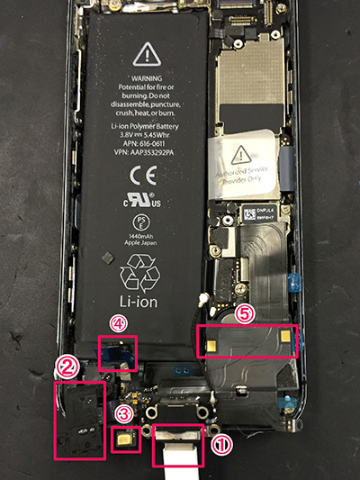 ④ホームボタンの接点。前にバッテリー膨張のブログで紹介した接点です。