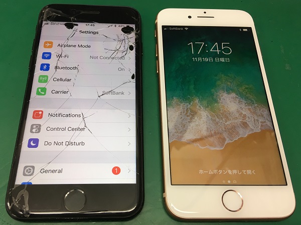 左がお客様の画面が割れてしまったiPhone7で、