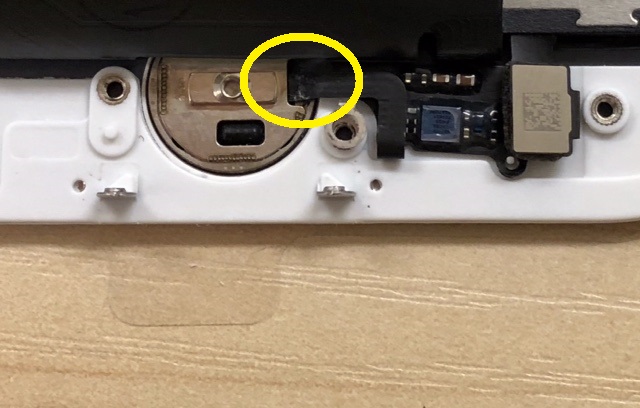 パネルを開けてホームボタン付近を確認すると、ケーブルに腐食跡(黄〇箇所)が見られました。おそらく、画面が割れている状態でしばらく使用されていた影響で、水分が侵入しケーブルが故障してしまったと思われます。念のため腐食をキレイに落としてみます。