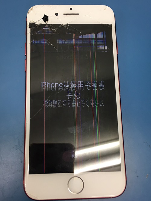 画面がカラフルな縦線でいっぱいになっており、「iPhoneは使用できません 15分後にやり直してください」の文字が出ていて、文字が激しく縦揺れしていました。