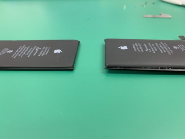 通常のバッテリーと並べてみると少し膨張しているのがよくわかります。
