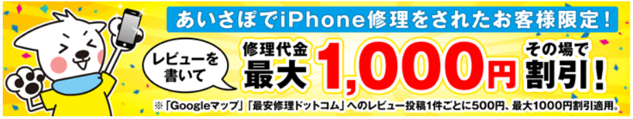 カンタンなレビューをしていただくだけで最大1000円引き致しますので、もっとお安く修理できますよ。