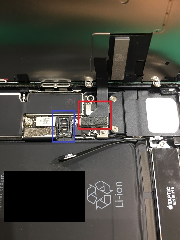 どのような修理もまず初めにバッテリーのコネクタから外していきます(青い四角)。