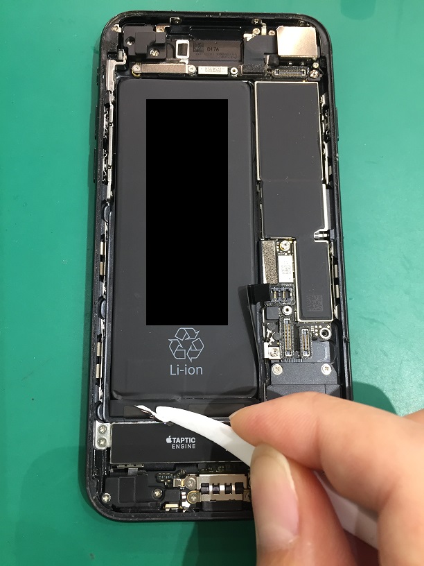 iPhoneの電源を切っていても、バッテリーのコネクタが付いている状態ですと通電はしていますので最初に外します。