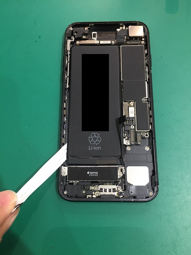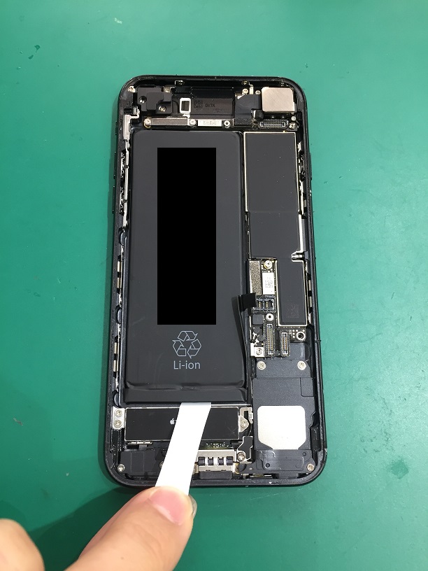 バッテリーは特殊な両面テープでくっついていますのでヘラでテープの耳をはがしてから丁寧に引っ張ってはがしていきます。