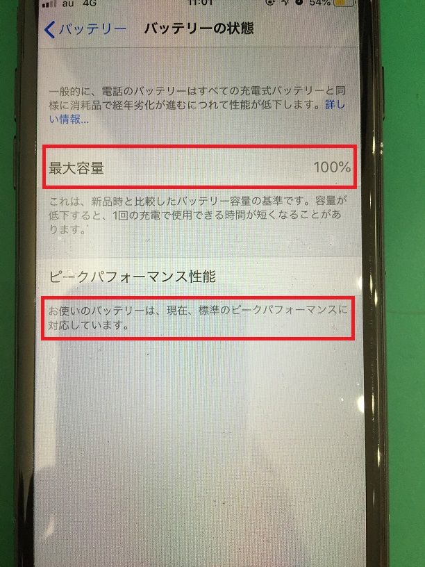 最後にiPhoneの設定→バッテリー→バッテリーの状態と進んでいきますと最大容量も100%で新品だということが分かりますね(^^♪